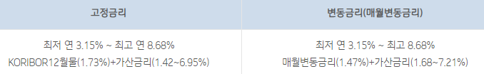 대출금리는 고정금리, 변동금리 상품으로 아래와 같습니다.