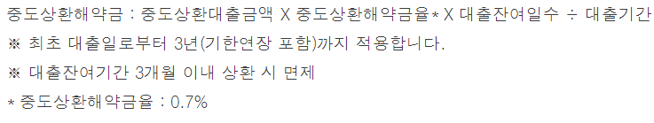 중도상환해약금은 대출약속기간 보다 먼저 상환시 내는 수수료로 0.7%이며, 대출기간이 3년이 지나면 면제입니다.