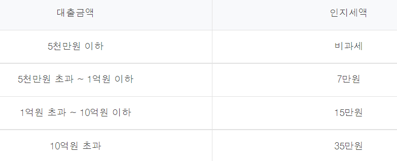 인지세는 인지세법에 따라 대출 약정을 체결 시 내는 세금으로 대출금액에 따라 세금은 위와 같이 차등 적용되며, 은행과 고객이 각각 50%씩 부담합니다.