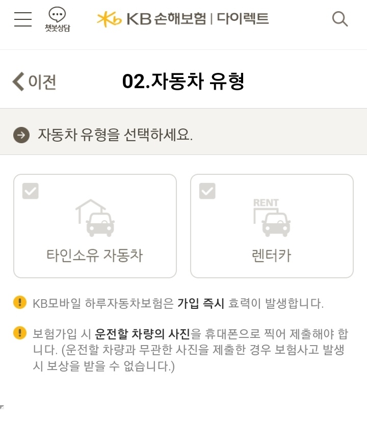 타인소유의 자동차인지 렌터카인지 자동차 유형에 대한 선택을 합니다.