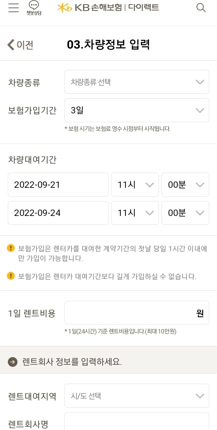 차량 정보와 보험 기간을 설정합니다.