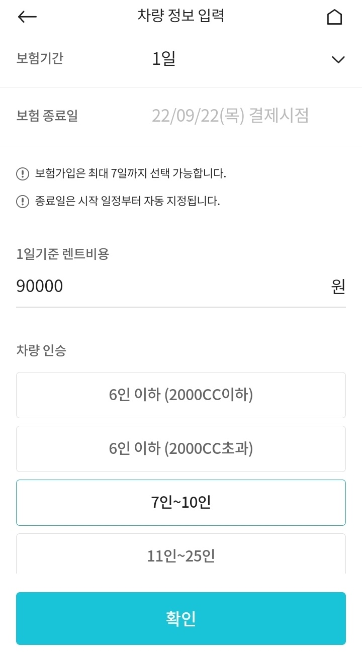 저는 렌트카를 기준으로 했으며, 보험기간 및 차량이 몇인승인지 체크를 합니다.