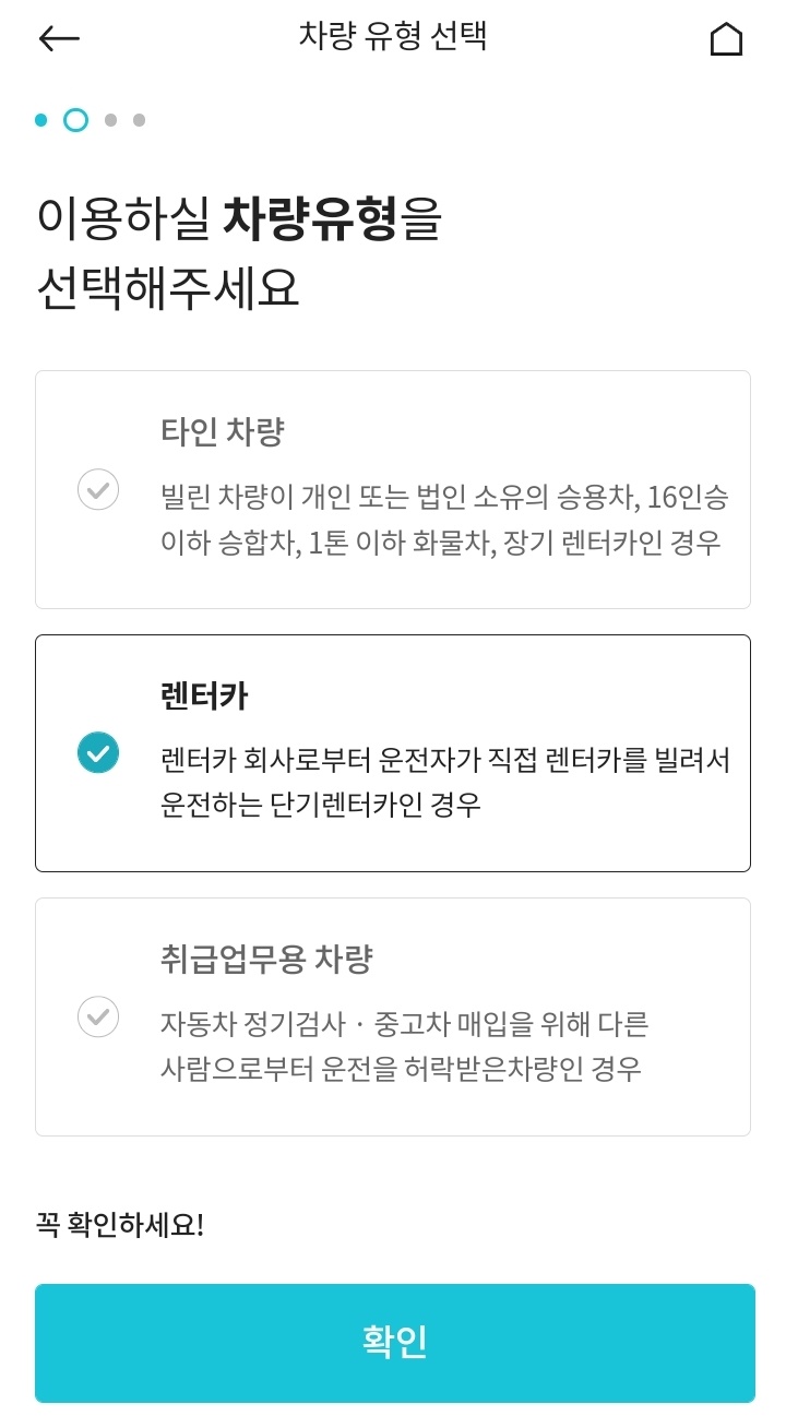 먼저 이용할 차량의 유형을 선택해주시면 됩니다.