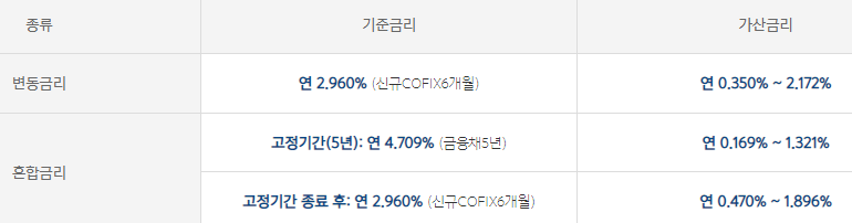 대출 금리는 변동금리를 선택하냐 혼합금리를 선택하냐에 따라 아래와 같이 달라집니다.