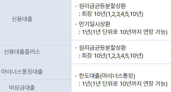 마찬가지로 신용대출의 기간 및 상환방법은 상품의 종류에 따라 달라집니다.