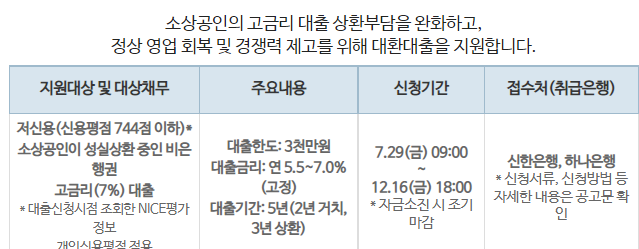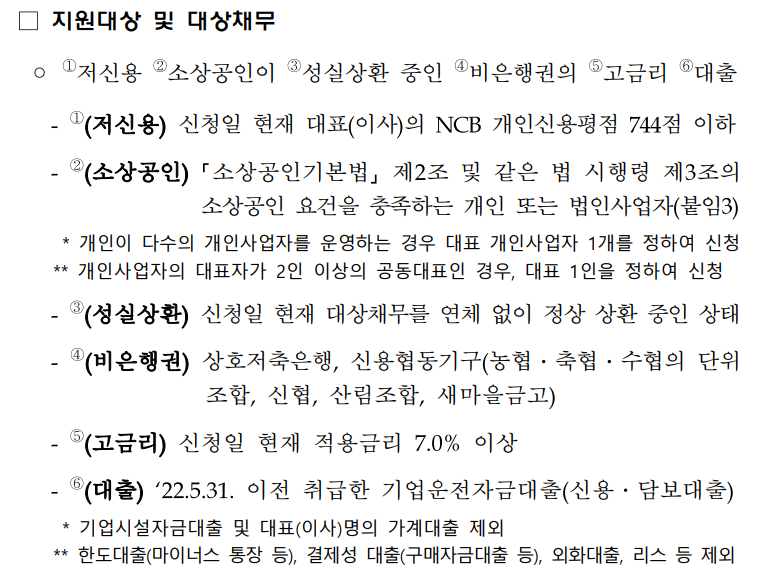 올해 5월 31일 이전에 대부업체가 아닌 비은행권에서 연 7% 이상의 고금리 대출을 받은 사람이 이 융자를 성실하게 상환 중인 저신용 소상공인이라면 이번 대환대출 대상이 됩니다.