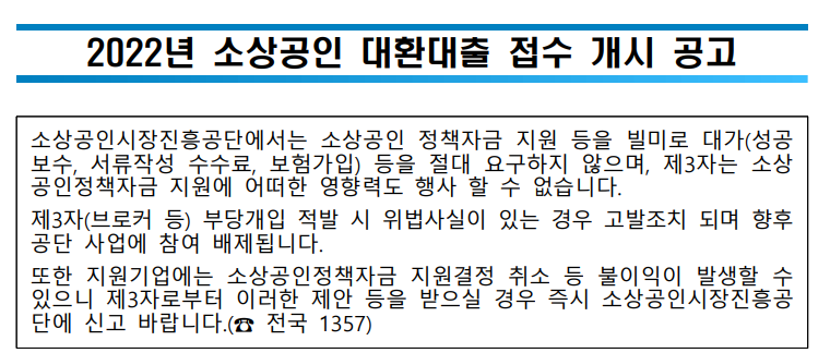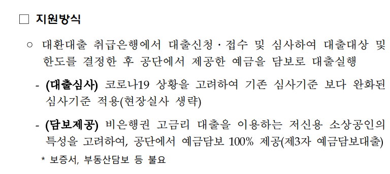 이번 대환대출은 부채 상환 부담으로 대환이 시급한 저신용 소상공인을 지원하기 위해 별도 보증 없이 융자방식으로 진행됩니다.