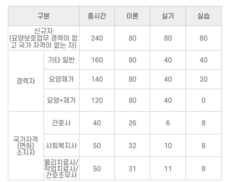 요양보호사 교육시간은 신규자일 경우 240시간 수료, 경력자일 경우 120~160시간을 수료해야 하며, 만일 국가자격 소지자의 경우는 40~50시간만 교육시간을 수료하면 됩니다.