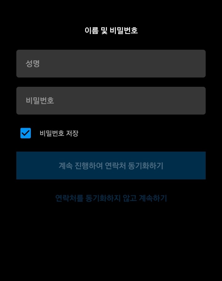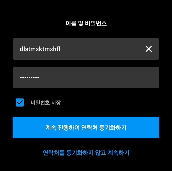 먼저 사용자 이름과 비밀번호를 설정합니다. 기억하기 쉬운걸로 하시면 되고 절대로 여기서 연락처를 동기화 하기를 누르면 안됩니다.