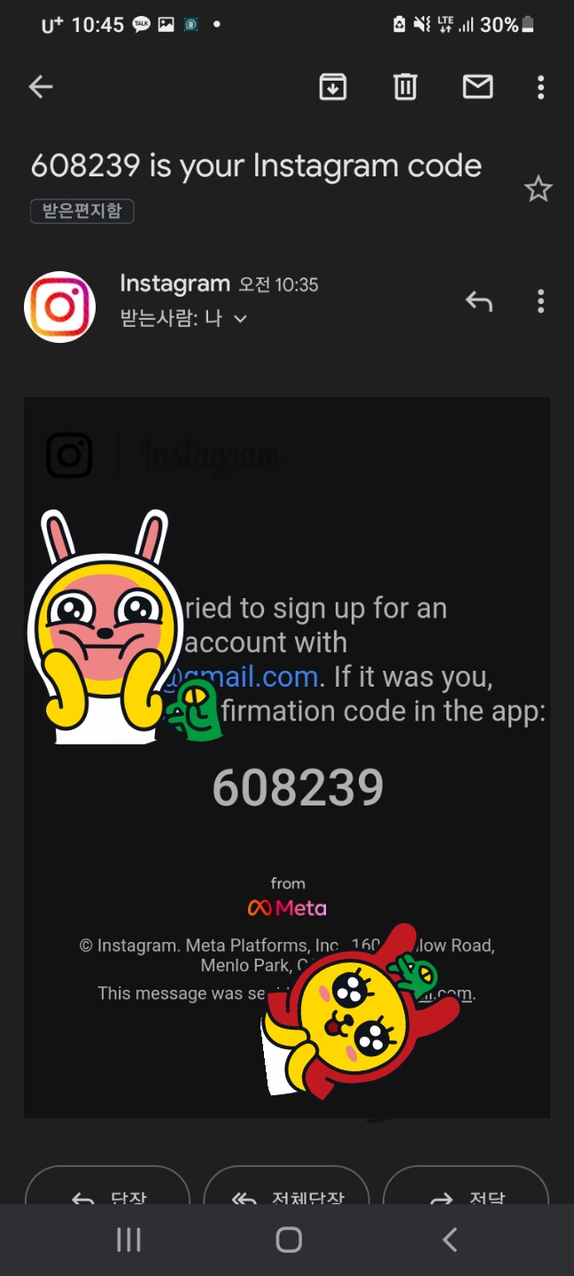 인스타 부계정 만들 때 구글계정으로 만들게 되면 구글메일로 인증 코드를 받아 가입을 완료 할 수 있습니다.
