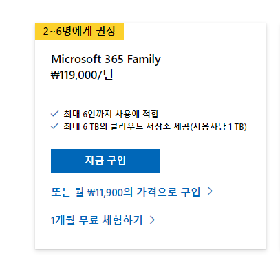 MS오피스 가족용은 위의 기능을 이용할 수 있으며, 1명 당 1TB의 클라우드 저장소와 모바일 기능에 접속할 수 있습니다.