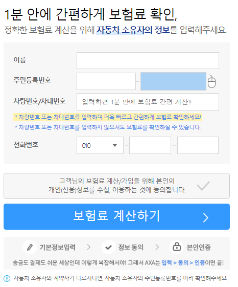 악사 다이렉트 자동차보험 보험료 확인 및 가입은 아래 선택하시면 기본 정보만 적고 바로 보험료 확인이 가능합니다.