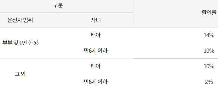 자녀할인 특약은 만 6세 이하 자녀가 있거나 임신중이라면 특약할인 혜택을 받을 수 있습니다.