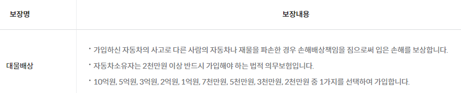 대물배상 = 다른 사람의 자동차 및 재물에 손해를 입힌 경우를 보상