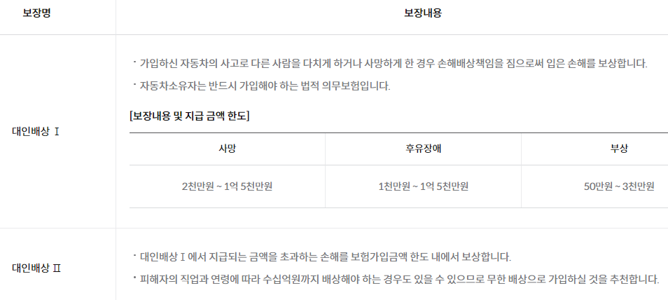 대인배상 = 다른 사람에게 상해,사망 등 손해를 입힌 경우 보상