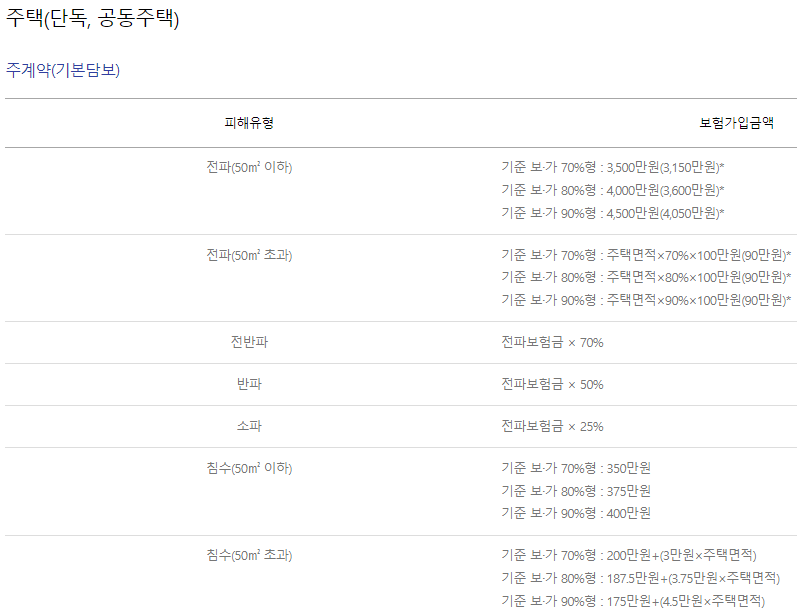 총 보험료 연 53,200원일 때 정부 지원 연 37,200원 , 주민부담 연 16,000원으로 보험금 규모는 소파 :1,800만원 / 반파 :3,600만원 / 전파 7,200만원정도로 예시를 들을 수 있습니다.