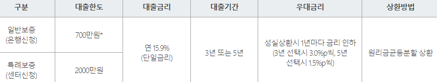 일반보증의 경우 한도 700만원이며, 특례보증의 경우 2천만원까지 가능합니다.