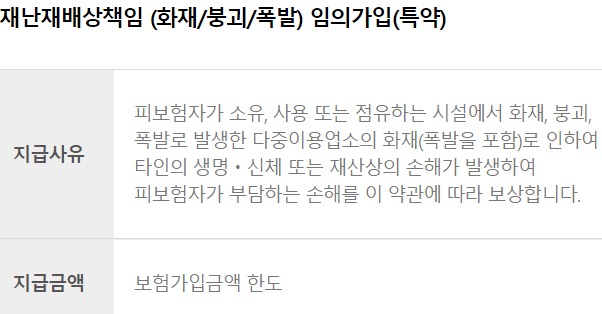 이 재난희망보험은 행정안전부와 함께 하는 보험으로 재난 발생 시 피해 배상 부담에 어려움이 있는 시설에 도움을 주기 위해 도입한 재난배상책임보험 주으이 하나로, 소규모 음식점은 의무보험 미가입 시 부과되는 과태료(최대 300만원) 규제를 완화하기 위해 의무가입 대상에 포함되어 있지 않아 재난 발생 시 재난배상 책임보험에 가입되어 있지 않다면 피해 배상에 어려움이 있었습니다.