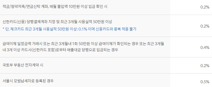 만일 금리 산정이 5.5%가 나오더라도 우대금리를 모두 충족하면 4.7%까지 금리를 낮출 수 있습니다.