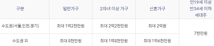 대출한도는 임차보증금의 70% (신혼가구/2자녀 이상 가구/만 19세 이상 만 34세 이하 세대주80%)이내까지 가능합니다.