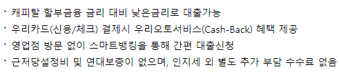 이 상품은 신차 구입을 위한 자동차 대출로 일반 캐피탈 자동차대출보단 금리가 저렴한 편에 속해 인기가 많은 대출 상품입니다.