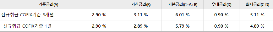 대출금리는 위와 같으며 신규취급COFIX기준으로 합니다.