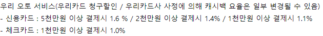 단 우리카드사 신용 및 체크카드 이용만 가능하며 결제 계좌도 우리은행이어야 합니다.