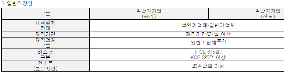 대출 조건은 현 직장 6개월 이상 재직중인 급여 소득자로 정확한 사항은 아래와 같습니다.