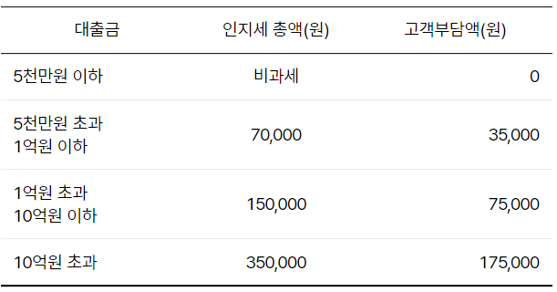 대출금의 5천만원까지는 인지세를 부담하지 않지만 인지세법에 의해 5천만원을 초과하는 금액은 대출금액에 따라 아래와 같이 인지세를 내야합니다.