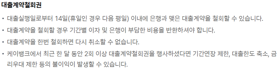 - 케이뱅크 자체 심사기준에 충족하지 못하거나 연체내역 등이 있는 경우나 이미 케이뱅크의 다른 대출을 보유하고 있는 경우 신청이 제한될 수 있습니다.