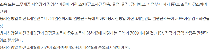 융자 신청일 현재 소속 또는 노무를 제공하는 사업장에서 3개월 이상 근로중인 근로자 및 특수형태근로자는 융자신청일이 속한 달의 직전 달 말일까지여야 하며,근로자가 없는 1인자영업자로 융자신청일 현재 중소기업사업주 산재보험 특례 가입기간이 3개월 이상이어야 합니다.