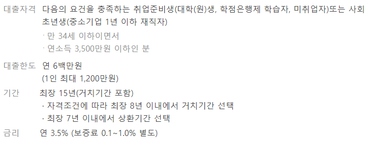 세부적인 대출 자격은 취업준비생,대학(원)생,학점은행제 학습자 및 미취업자 또는 사회초년생인 분들이 가능합니다.