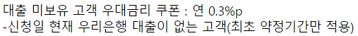 우리은행의 대출을 처음 이용하시는 분들이라면 우대금리 쿠폰을 받을 수 있으니 참고하시길 바랍니다.