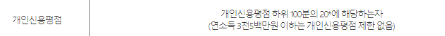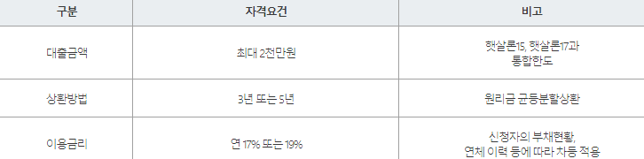 연 20%를 초과하는 고금리 대출을 1년 이상 이용중에 만기가 6개월이 채 남지 않았거나 정상적으로 상환하고 있는 저신용 및 저소득자가 대출대상이며, 연소득 3천5백만원 이하 또는 연소득 4천 5백만원 이하이면서 개인신용평점 하위 100분의 20에 해당하는 사람이 대환대출을 받을 수 있습니다.