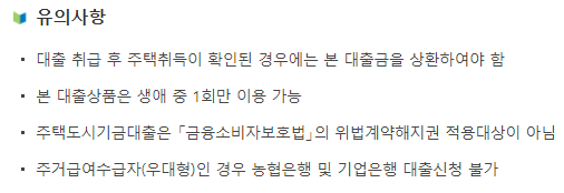 - 대출 접수일 현재 공공임대주택에 입주하고 있는 경우 불가 단 대출신청 물건지가 해당 목적물인 경우 또는 대출신청인 및 배우자가 퇴거하는 경우엔 대출 가능