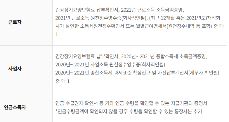 - 소득 산정은 최근 3개월 건강보험료 납부확인서 또는 2021년 소득금액증명원 등으로 최근 1년 소득을 산정합니다.