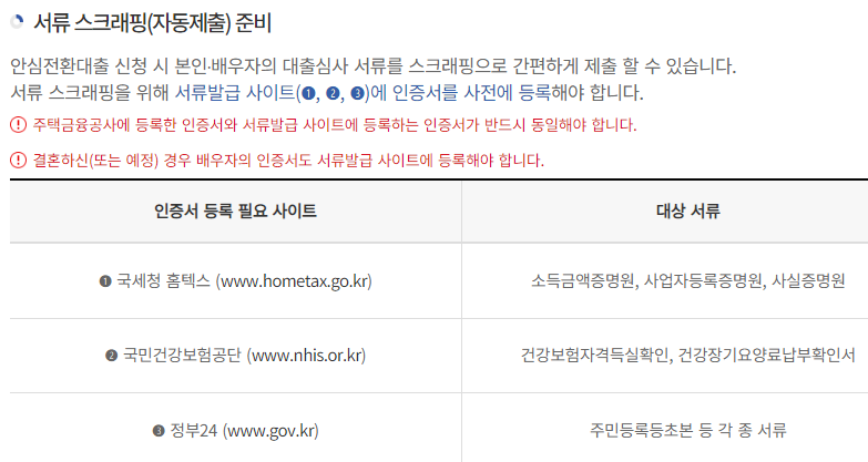 단 대부분의 서류는 신청 시 스크래핑을 통해 정상적으로 진행될 경우 자동으로 제출됩니다.