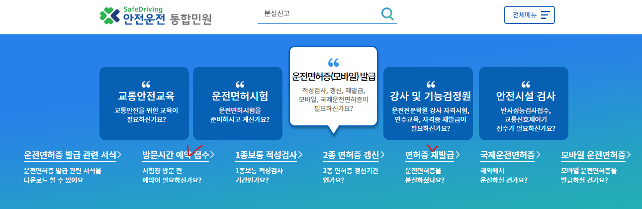 방문시간 예약 접수 혹은 면허증 재발급 등 여러 민원 중 원하는 민원을 클릭합니다.
