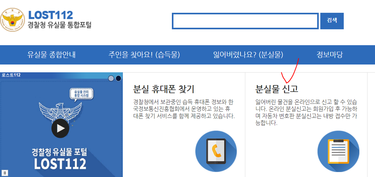 홈페이지 접속 후 분실물 신고를 클릭합니다.
