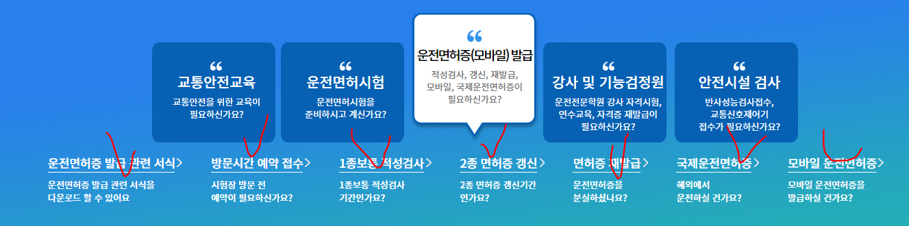 클릭하고 나면 운전면허증 발급 관련 서식, 방문시간 예약 접수, 면허증 재발급 등 원하시는 민원을 클릭하시면 아래 사진과 같이 창이 나옵니다.