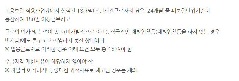 -이직일 이전 18개월간(초단시간 근로자의 경우 24개월) 피보험 단위기간이 합산 180일 이상이어야 합니다.