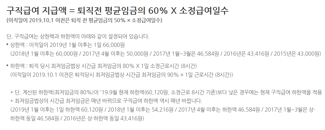 구직급여 지급액의 경우 퇴직 전 평균임금의 60% X 소정 급여일수로 계산하면 되고 상한액은 1일 66,000원입니다.