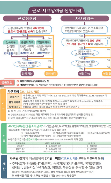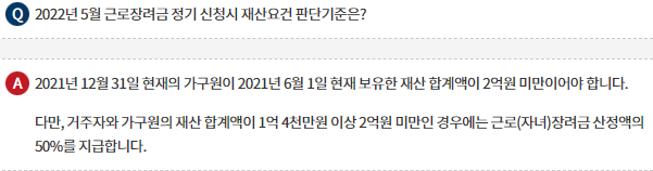 전년도 6월 1일 기준 가구원 재산 합계액이 2억 원 미만(단 1억 4천만 원 이상의 경우엔 기준 장려금에서 50%만큼 차감되어 지급) 부동산, 전세금, 자동차, 예금 전부 합한 금액이 2억 미만이며 부채는 차감하지 않습니다.