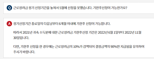 이상으로 근로장려금 자격과 신청방법에 대하여 알아보았습니다. 신청 기간이 지난 이후에도 10% 차감된 금액이긴 하지만 혜택을 받을 수 있으니 꼭 챙기시길 바라겠습니다.