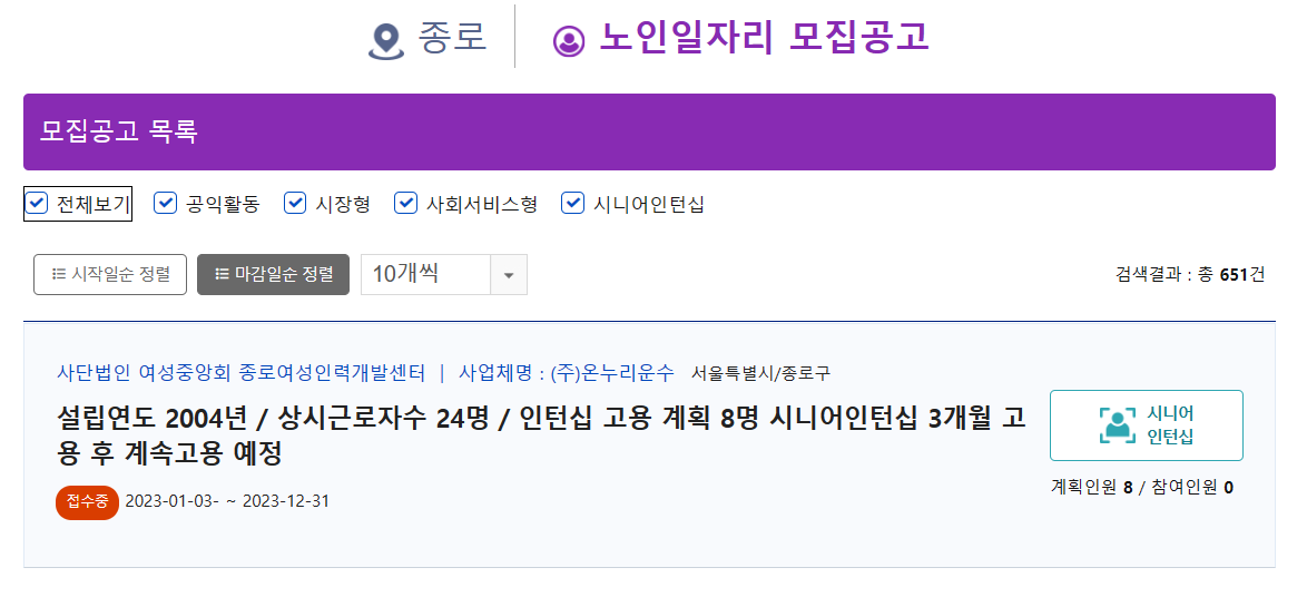 일자리 유형별, 마감일 순별로 자세하게 나와 있으며 현재도 종로구에만 651건이나 있는 노인일자리 구직 공고가 올라와있으니 확인하셔서 진행 하실 수 있습니다.